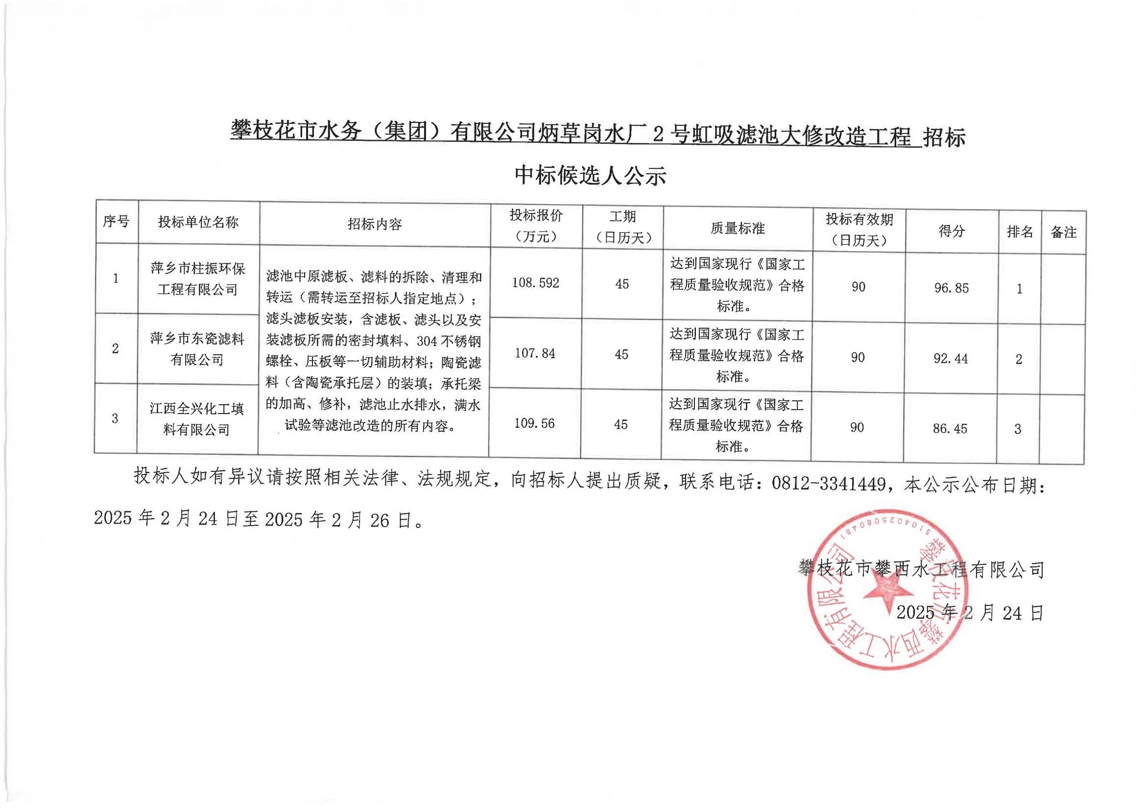 攀枝花市水務(wù)(集團)有限公司炳草崗水廠2號虹吸濾池大修改造工程中標候選人公示